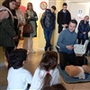 Ai bambini è stata spiegato l' uso del macchinario attraverso la simulazione con un manichino e il numero da chiamare in caso di emergenza.