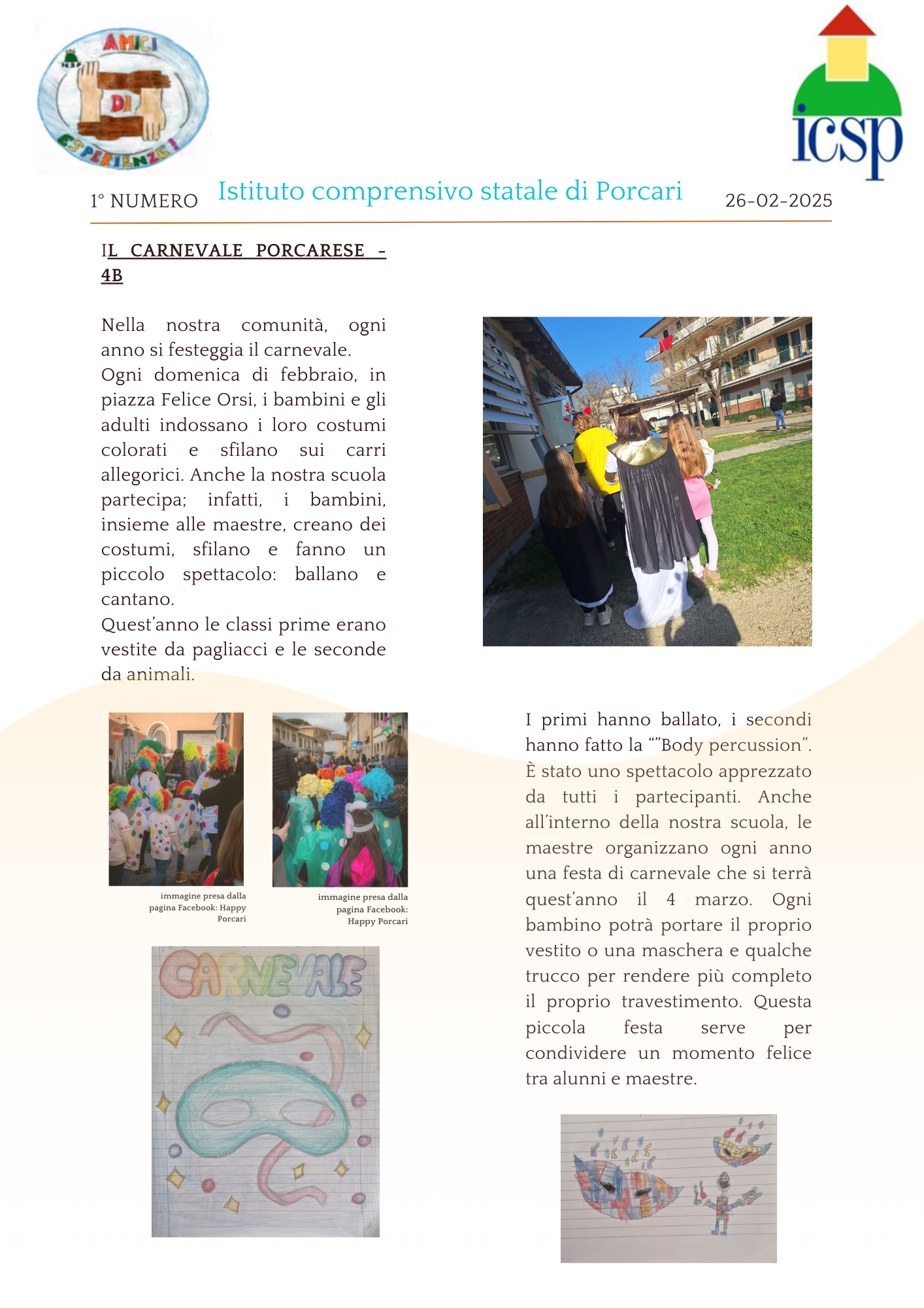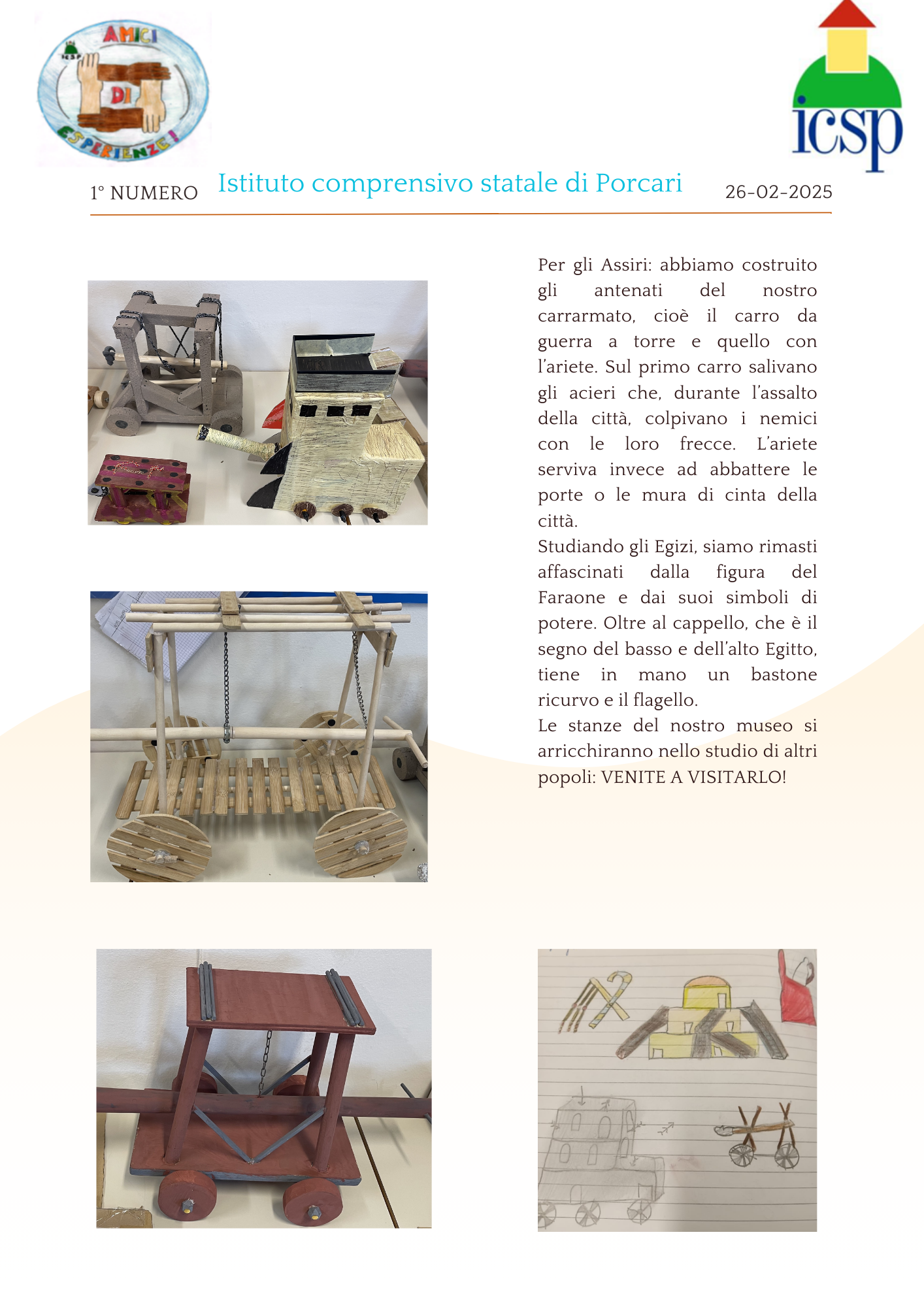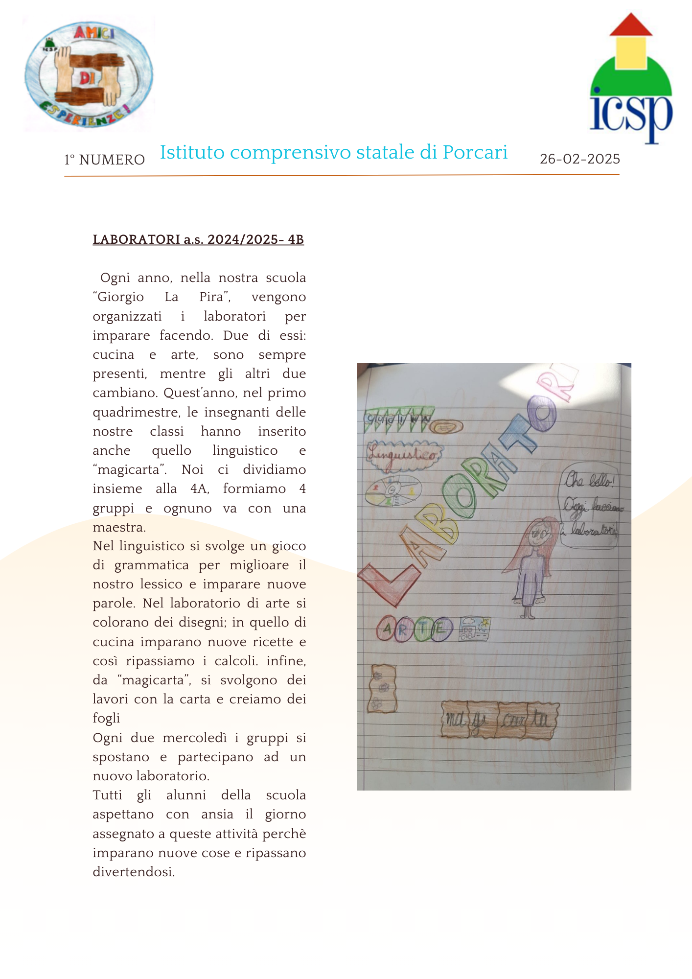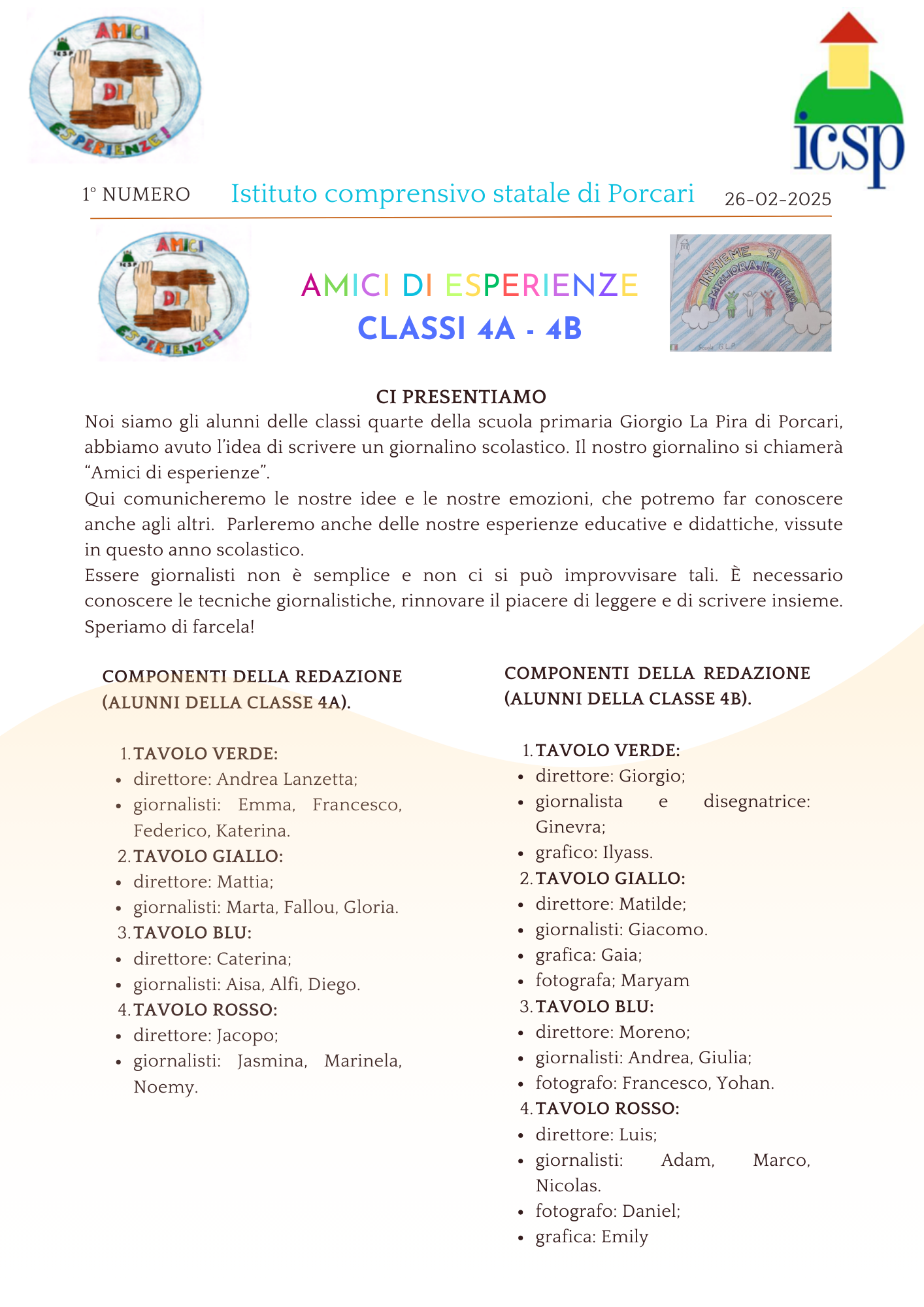 Noi siamo gli alunni delle classi quarte della scuola primaria Giorgio La Pira di Porcari, abbiamo avuto l'idea di scrivere un giornalino scolastico. Il nostro giornalino si chiamerà "Amici di esperienze".