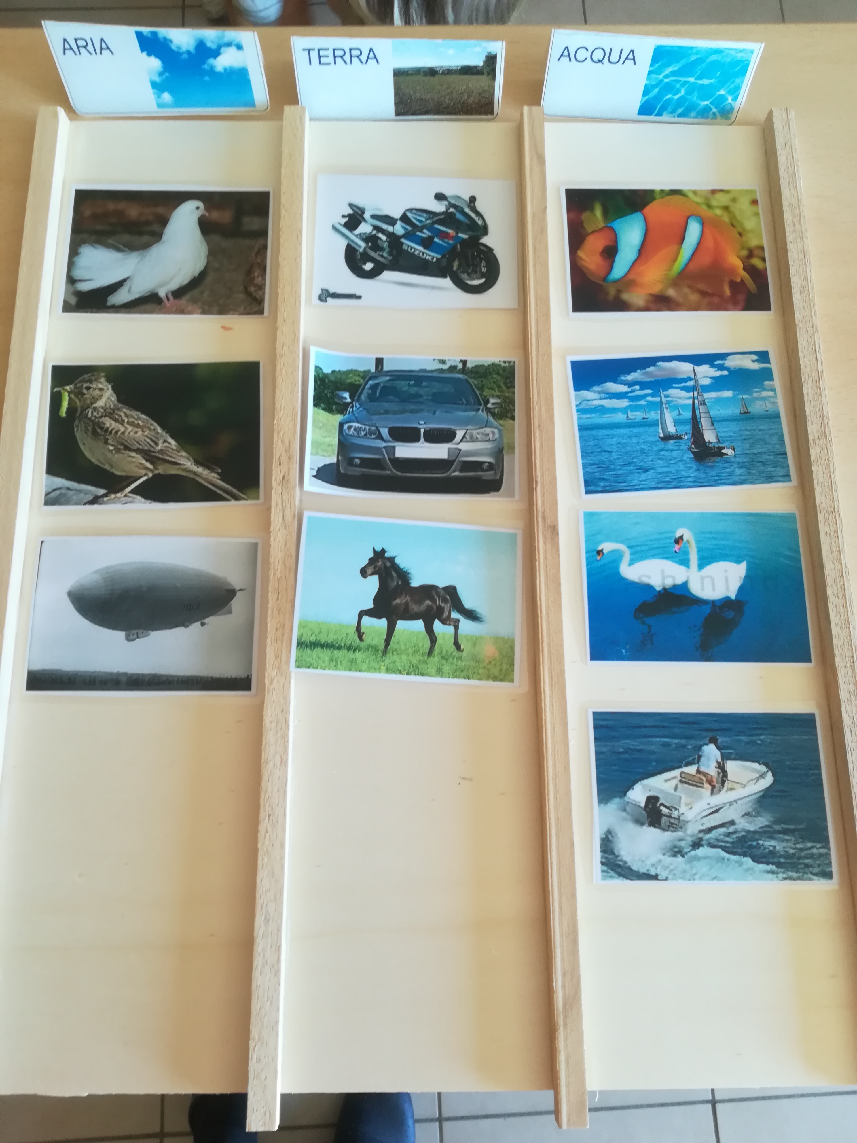 Strumento da utilizzare individualmente o in piccolo gruppo,costituito da un vassoio in legno suddiviso in tre scompartimenti e tessere plastificate raffiguranti oggetti di aria acqua o terra.. I bambini dopo aver scelto una tessera devono pronunciare il nome dell ' oggetto raffigurato e disporla nella giusta colonna.