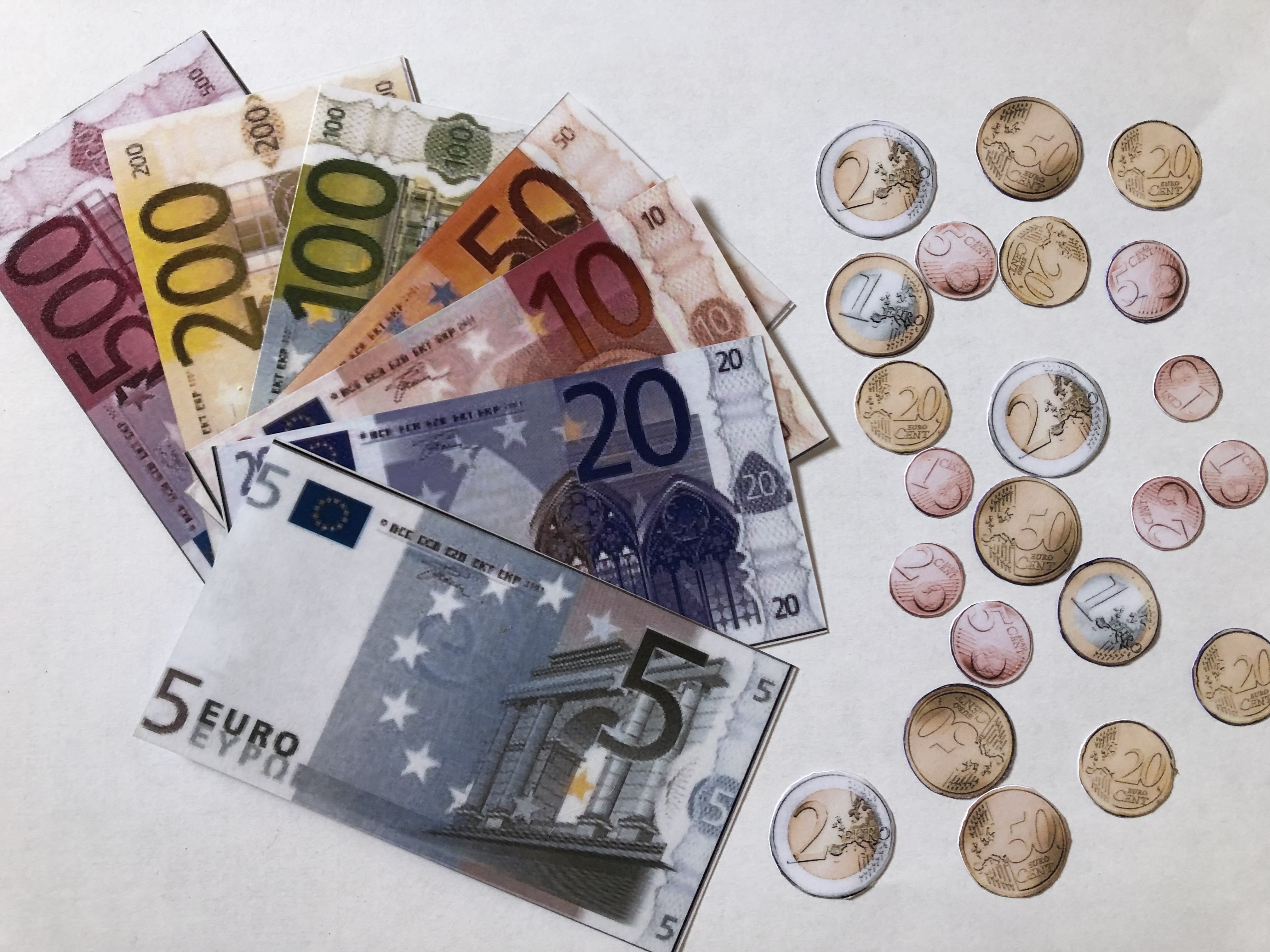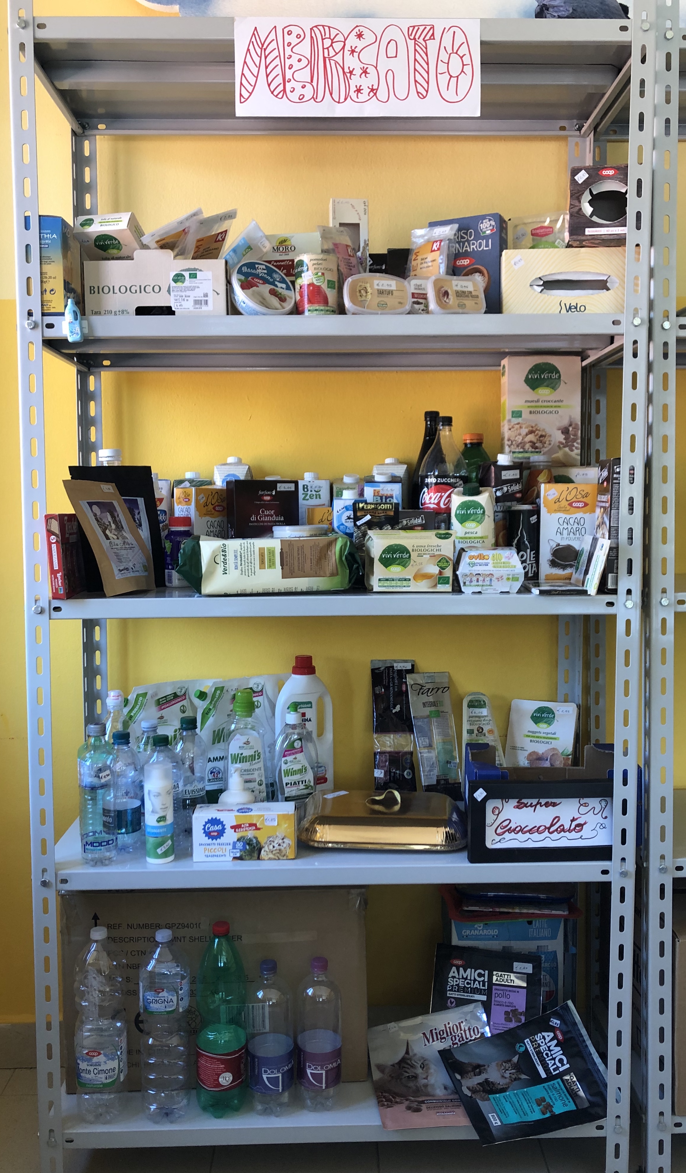 Scaffale con almeno 3 ripiani che permette l’esposizione di scatole, bottiglie e imballaggi di prodotti utilizzati nel quotidiano con relativi costi. Banconote e monete stampate e plastificate da utilizzare nelle attività di scambio.