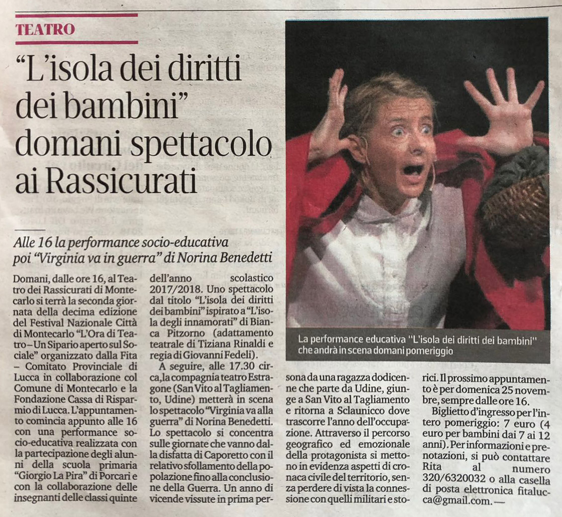 Gli alunni delle ex classi VA VB e VC della scuola primaria G. La Pira hanno presentato il giorno 18 di novembre 2018, all’interno del Festival Nazionale “L’ora di teatro”, lo spettacolo teatrale “L’Isola dei diritti dei bambini” al Teatro dei Rassicurati di Montecarlo.